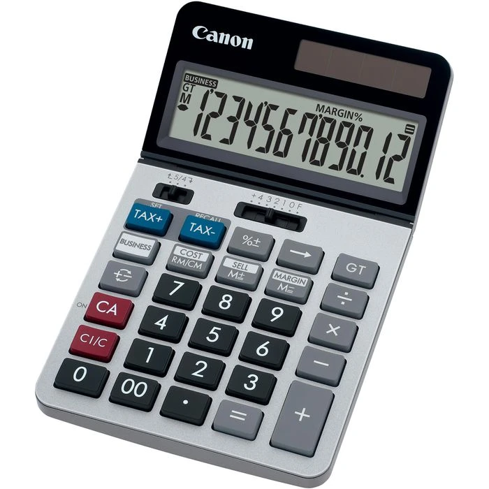 sonstiges: extragroßes klappbares Display, Prozentrechnung, Tausenderunterteilung, Fließ- und Festkomma, Vorzeichenwechsel, Grand Total Speicher, 00-Taste, Rundungsfunktion, Gewinnspannenberechung (Cost/Sell/Margin), Korrekturtaste