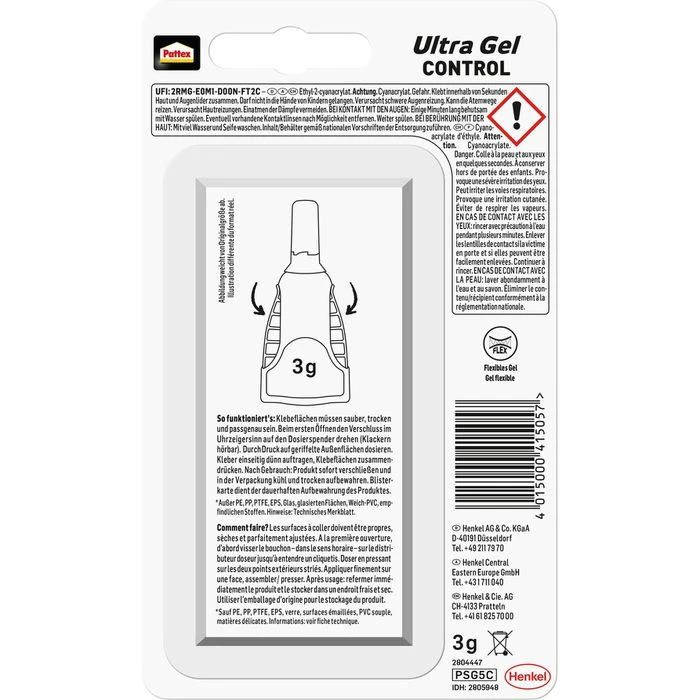EUH202: Cyanacrylat. Gefahr. Klebt innerhalb von Sekunden Haut und Augenlider zusammen. Darf nicht in die Hände von Kindern gelangen.