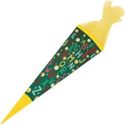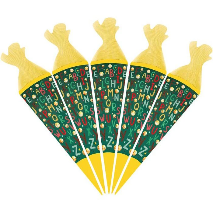 • Schultüte in gelb mit buntem Alphabet-Motiv